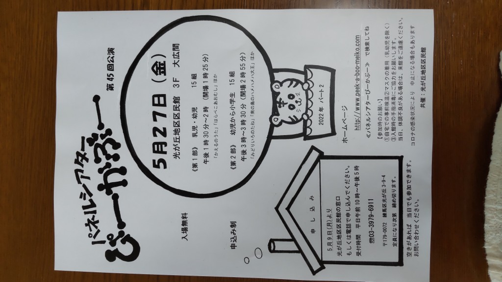 | 会場 | 5月27日 第45回ぴーかぶー定期公演(光が丘地区区民館) |