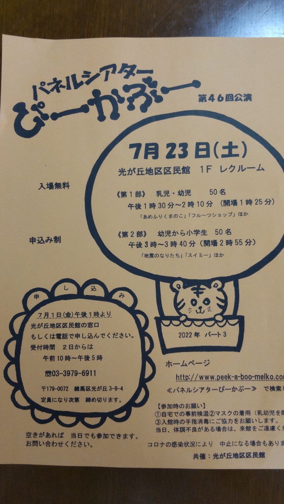 第1部 乳幼児向け 定員50名 13:30~14:10 あめふりくまのこ、フルーツショップ他(ブラックあり)   第2部 幼児から小学生 定員50名 15;00~16:10 地震の成り立ち、スイミー 他(ブラックあり) ぴーかぶーの公演の前に日本女子大の学生によりパネルシアターをみてもらいます。 保育文化の授業でパネルシアターの製作と実演を学んでいます。   どちらの回も年齢に関係なく楽しめますので、ご家族でいらしてください。 申し込み制ですが、当日も空きがあれば参加できますので、お問い合わせください。
